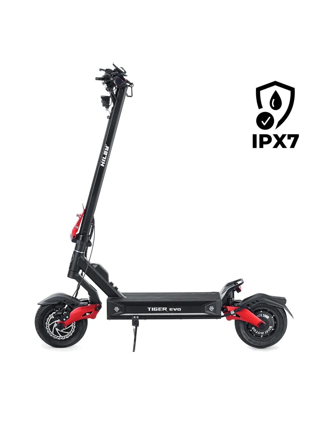 Tiger Evo GTR wyróżnia się nową, wyjątkową wodoodpornością klasy IPX7. To nie tylko ochrona przed przypadkowym zachlapaniem, ale pełna odporność na zanurzenie w wodzie do 1 metra przez 30 minut. Przy takich rozwiązaniach nie ma już potrzeby na dodatkowe doszczelnienia. Dzięki temu, nie musisz obawiać się nagłego deszczu, kałuż czy mokrej nawierzchni. Elektronika i złącza hulajnogi są zabezpieczone, co pozwala Ci cieszyć się jazdą bez względu na warunki pogodowe. Pamiętaj jednak, że IPX7 chroni przed zalaniem, a nie jest przystosowaniem do ciągłej jazdy w zanurzeniu. Długotrwałe narażenie na wodę może nadal spowodować uszkodzenie urządzenia.