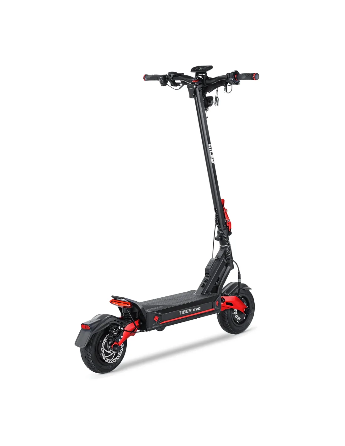 Innowacyjny system Split-rim tubeless (dzielona felga) w połączeniu z bezdętkową oponą 10″ CST i złączkami na silnikach pozwala na szybką i łatwą wymianę opon bezdętkowych. Każde z kół zostało wyposażone w błotniki, które chronią przed zachlapaniami. Zestawienie kół o średnicy 10 cali oraz podwójnej sprężynowej amortyzacji z możliwością regulacji twardości, zapewniają niezwykle satysfakcjonujący komfort jazdy po miejskich nierównościach oraz drogach żwirowych. Dzięki takiemu rozwiązaniu Tiger Evo GTR gwarantuje wygodne przemieszczanie się zarówno po ulicznych drogach, jak i terenach o bardziej wymagającym podłożu. Nierówności są skutecznie tłumione, a Ty możesz cieszyć się płynną i stabilną jazdą.