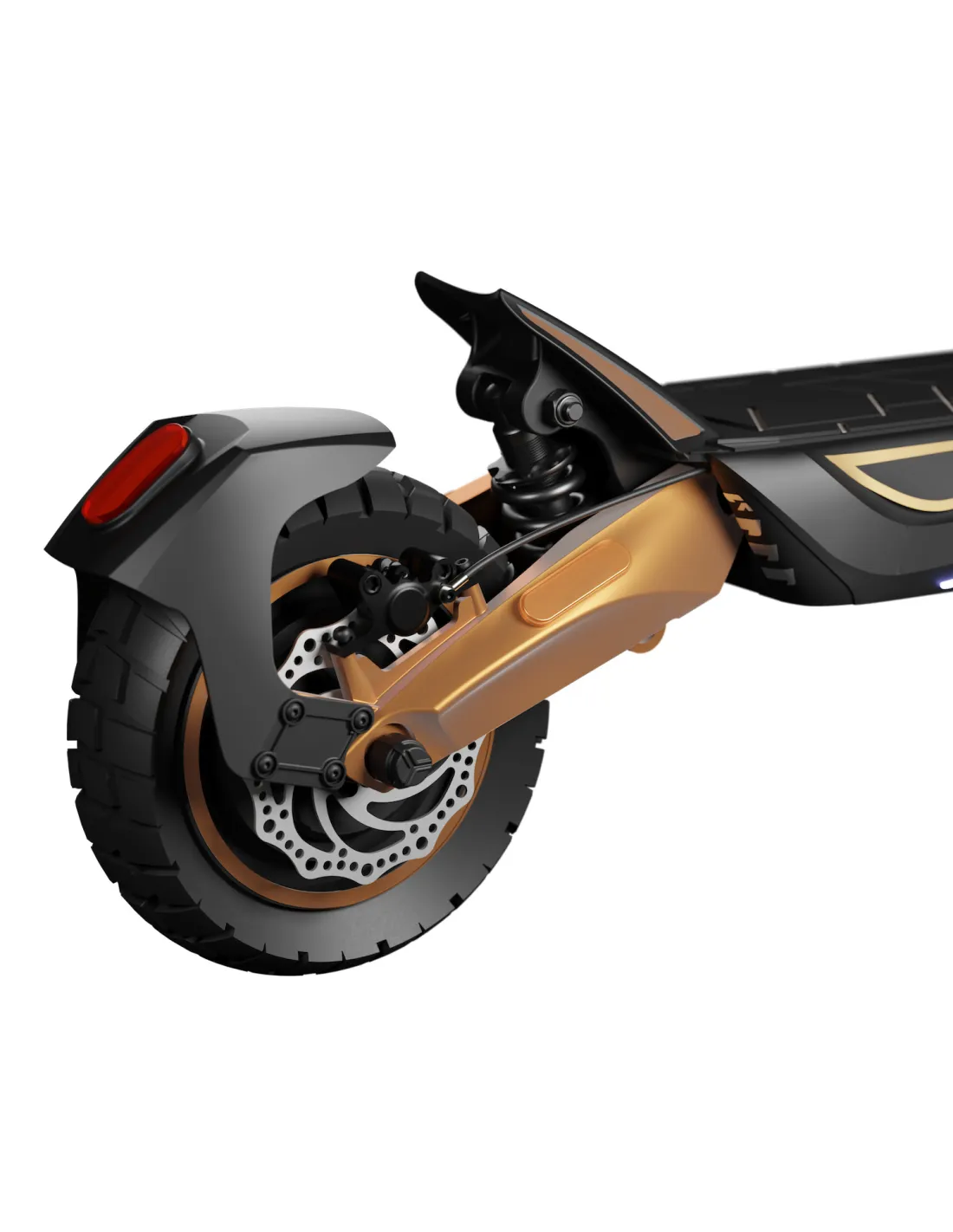 Jest to zdecydowanie maszyna bez granic, a jej opony to potwierdzają – terenowo-szosowy bieżnik zapewnia przyczepność zarówno na asfalcie, jak i na luźnych nawierzchniach. Bezdętkowa konstrukcja zwiększa odporność na przebicia, a szeroki profil gwarantuje stabilność nawet w najtrudniejszych warunkach. To hulajnoga, która pojedzie tam, gdzie inni muszą zawrócić.