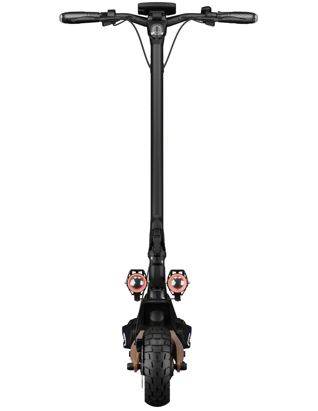 - Oświetlenie: Dwie przednie lampy z czerwonymi ringami z odcięciem wiązki światła około 780 lm oraz lampka na szczycie kolumny doświetlająca obszar przed hulajnogą (regulowana)