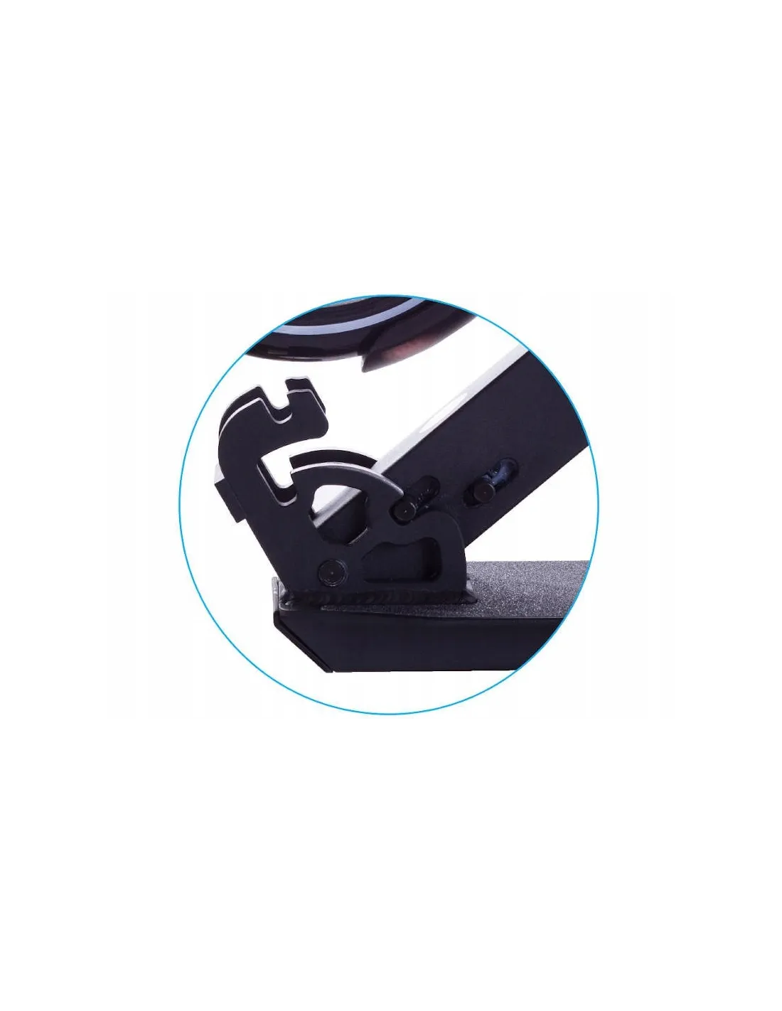 Zatrzaśnięcie i zabezpieczenie hulajnogi przed przypadkowym złożeniem w pozycji otwartej następuje dzięki zaczepieniu 2 niezwykle wytrzymałych prętów za 2 pancerne rowki w formie klina. Proste i niezawodne oraz bezpieczne rozwiązanie! Przedstawiony składany mechanizm ma 3 pozycje.