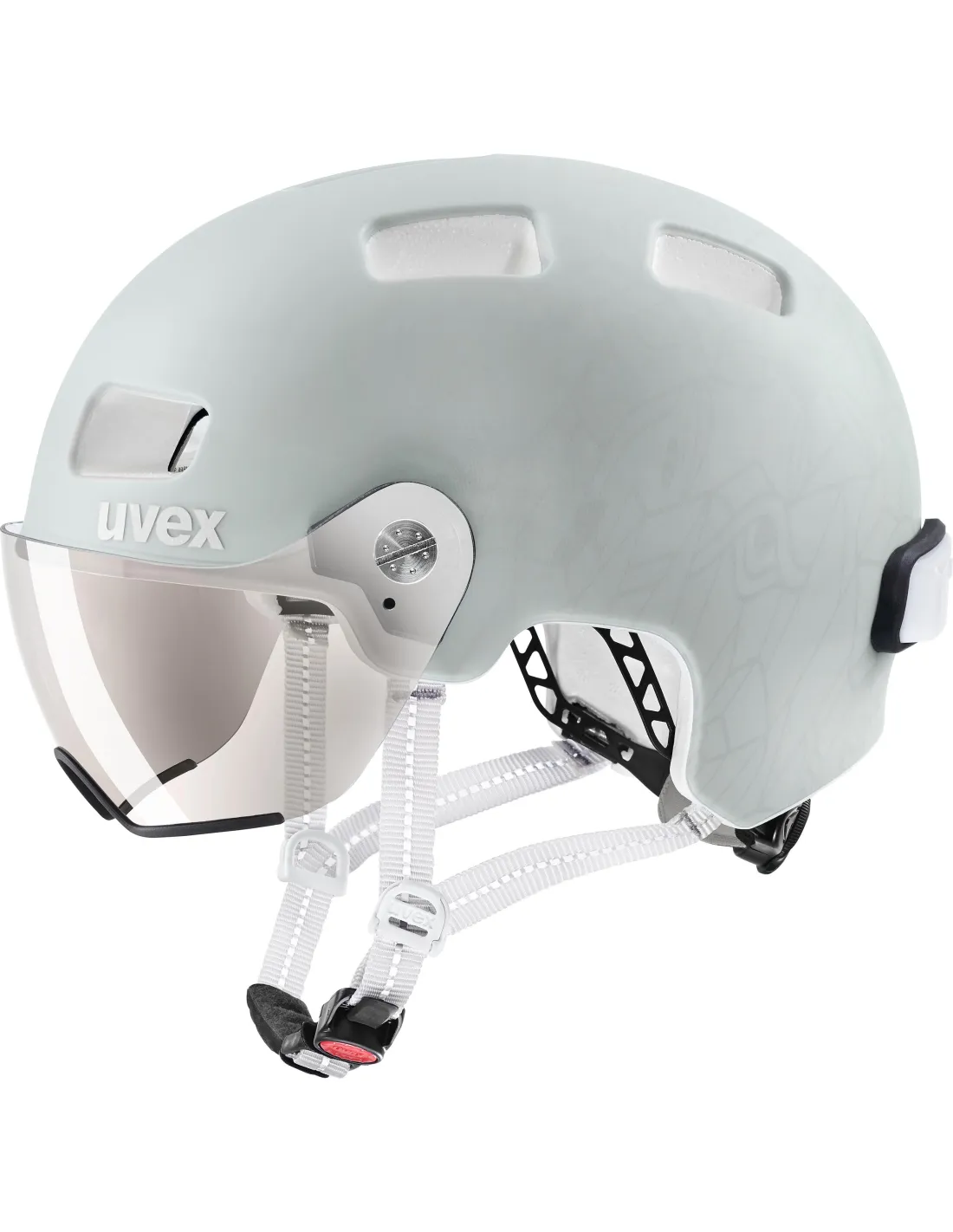 Kask rowerowy Uvex Rush Visor przeznaczony jest dla użytkowników chcących posiadać niezwykle bezpieczne i wygodne zabezpieczenie głowy i oczu w trakcie jazdy na rowerze. Szybka na przodzie ochroni nasze oczy przed wiatrem, promieniami słonecznymi oraz zanieczyszczeniami mogącymi wypaść spod kół jadących samochodów. Rush Visor wyposażony jest w system pasków FAS, regulację obwodu i głębokości 3D IAS Fit, zapięcie Monomatic oraz wyściółkę typu Basic, lampkę LED, odblaski i soczewkę LiteMirror Silver cat. 1. Za dostarczenie odpowiedniej ilości powietrza pod skorupę kasku odpowiedzialnych jest aż 10 kanałów. Jest to niezwykle ważne, by kask był przewiewny, jeżeli poruszamy się z niskimi prędkościami po miejskiej dżungli. Ale do tego właśnie został on stworzony! Do miasta nie ma lepszego!