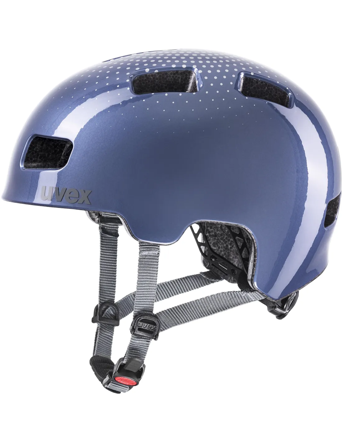 Uvex HLMT 4 to stylowy i designerski kask przeznaczony dla dzieci, młodzieży, a nawet dla dorosłych. System IAS FIT oraz regulacja pasków FAS umożliwia odpowiednie dopasowanie, przez co kask nie zsunie się z głowy podczas upadku. 2 rozmiary skorupy pozwalają na dobranie odpowiedniej wielkości do wieku użytkownika. 10 kanałów wentylacyjnych w szybkim tempie chłodzi wnętrze pod skorupą kasku. Dzięki temu jazda nawet w upalne dni będzie przyjemnością! Wyjmowana wyściółka typu Basic jest łatwa do wyciągnięcia. Można ją prać, dzięki czemu zachowamy dłuższą świeżość we wnętrzu kasku. Zabudowany kask oferuje większe bezpieczeństwo przy upadku na plecy chroniąc potylicę użytkownika. HLMT 4 jest idealny do rozpoczęcia poważniejszej przygody z rowerami, hulajnogami oraz rolkami i deskorolkami.