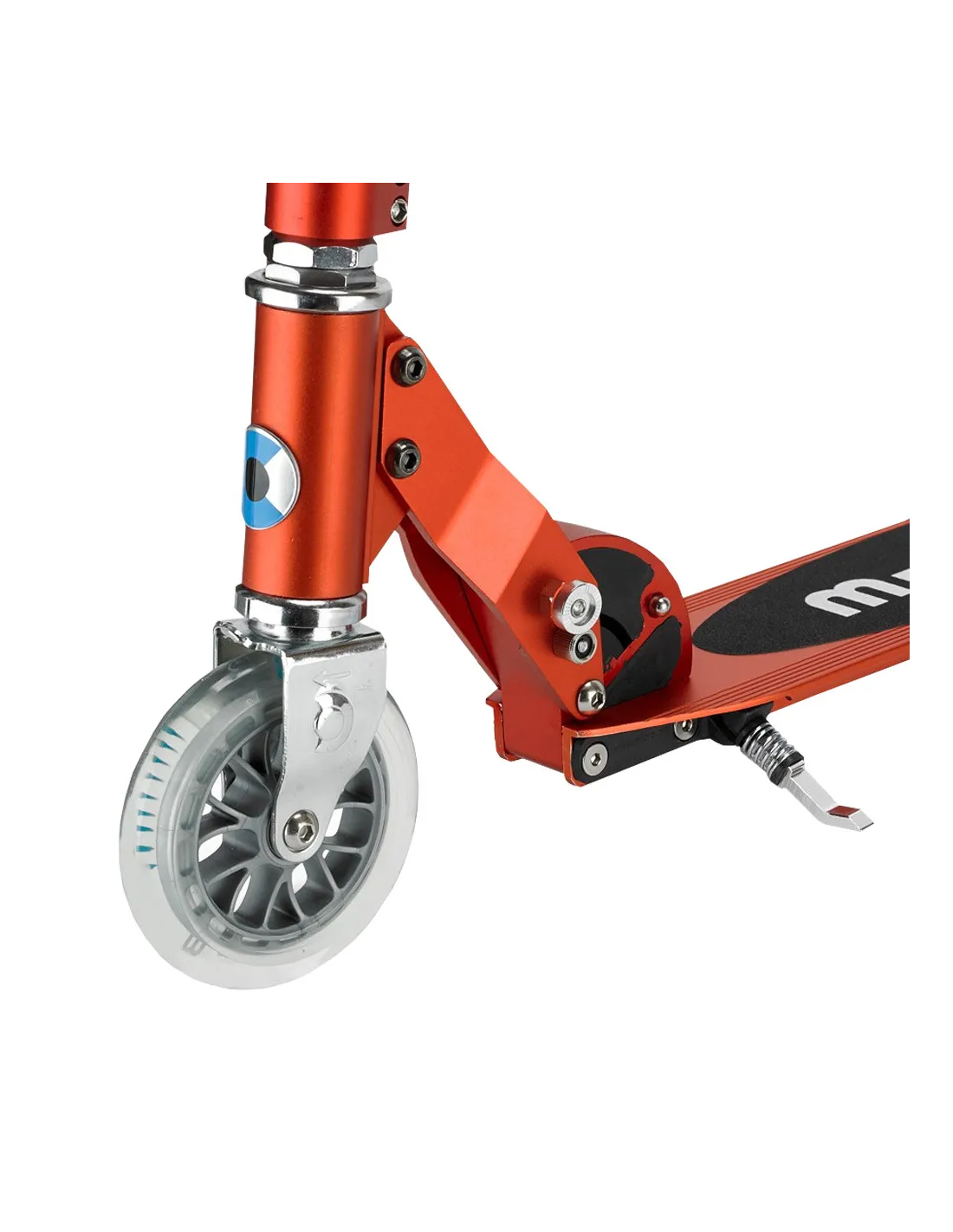 Micro Sprite to przede wszystkim prostota i solidne wykonanie i wysoka jakość widoczna gołym okiem. Długi podest (całkowita długość hulajnogi wynosi 640 mm) został wyłożony antypoślizgową okleiną, dzięki czemu jazda na Micro Sprite jest bardzo stabilna i bezpieczna. Rączki kierownicy pokryte są miękką pianką zapobiegająca zsunięciu się dłoni podczas jazdy oraz zapobiega bólowi nadgarstków przy dłuższej jeździe. Przednie koło o średnicy 120 mm, natomiast tylne 100 mm zapewniają stabilną jazdę po różnych rodzajach nawierzchni. Koła zostały wyposażone w gładko obracające się łożyska, zapewniając komfortową i bezawaryjną jazdę. Micro Sprite idealnie sprawdza się do jazdy w parku, na ścieżce czy też na podwórku szkolnym. Świetnie również sprawdzi się jako środek transportu z domu do pracy dla osób dorosłych! Dodatkowo hulajnoga została wyposażona w nóżkę (stopkę), dzięki której ustawimy hulajnogę w pozycji stojącej. Od teraz nie musimy opierać hulajnogi o ścianę ryzykując zarysowanie kierownicy lub zostawienie śladów na tynku budynku. Tylne koło zostało wyposażone w hamulec nożny. Jest on łatwy i prosty w użyciu. Wystarczy jedynie nacisnąć delikatnie hamulec piętą, co spowoduje łagodne zatrzymanie hulajnogi i wytracenie prędkości wtedy, gdy tego chcemy bez obawy o uślizg koła lub stracenie panowania nad pojazdem.