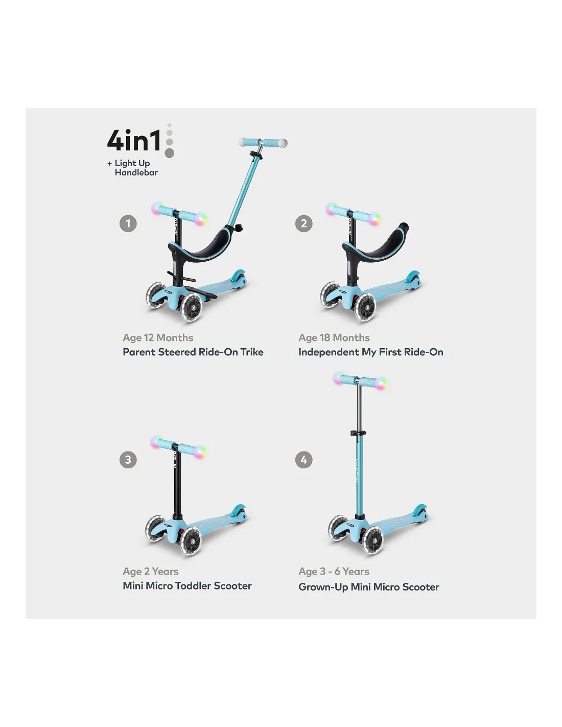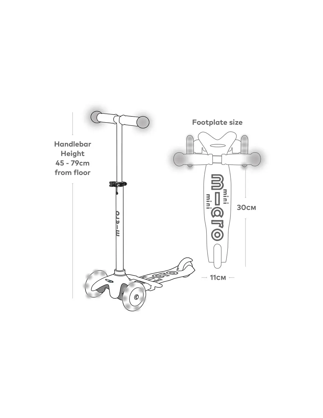Micro Mini2Grow Magic LED można określić mianem pojazdu doskonałego. Wraz z rozwojem dziecka, pojazd będzie ewoluował, by jak najlepiej dostosować się do użytkownika. Regulowana na wysokość kierownica, możliwość odpięcia podnóżków oraz siedziska. Wszystko to sprawia, że w okresie od 12 miesiąca życia, a może nawet wcześniej, do 6 roku życia, a może nawet i dłużej Mini 2 Grow będzie z Twoją pociechą najlepszymi przyjaciółmi. Szeroki na 11 cm i długi na 30 cm obszar roboczy pozwala wygodnie ustawić stopy na podeście. Dzięki temu nawet dłuższe spacery i wspólne przejażdżki nie będą dyskomfortem dla dzieciaka.