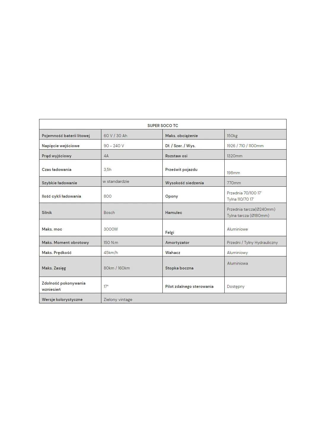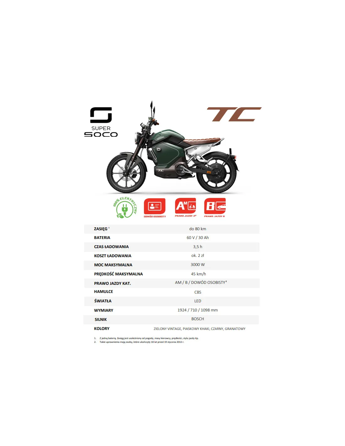 Elektryczny motorower Super Soco TC to połączenie klasycznego stylu i nowoczesnej technologii stworzone z myślą o dynamicznym poruszaniu się po mieście. Wydajny akumulator umożliwia pokonywanie długich dystansów bez obaw o zasięg, a mocny silnik elektryczny zapewnia płynne i energiczne ruszanie spod świateł. Ergonomiczna pozycja za kierownicą oraz komfortowa kanapa sprawiają, że każda trasa – krótka czy długa – staje się przyjemnością. Całość dopełnia ponadczasowa linia inspirowana stylem Cafe Racer.
