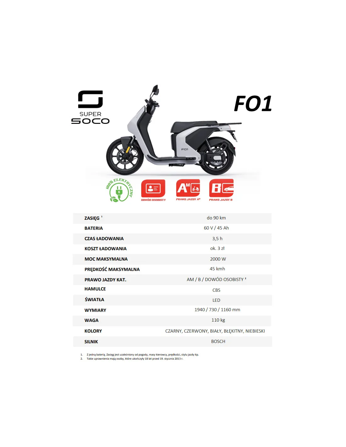 - F01 wzmacnia flotę pojazdów Super Soco typu Cargo i jest specjalnie zaprojektowany dla biznesu, dostaw i wypożyczalni.