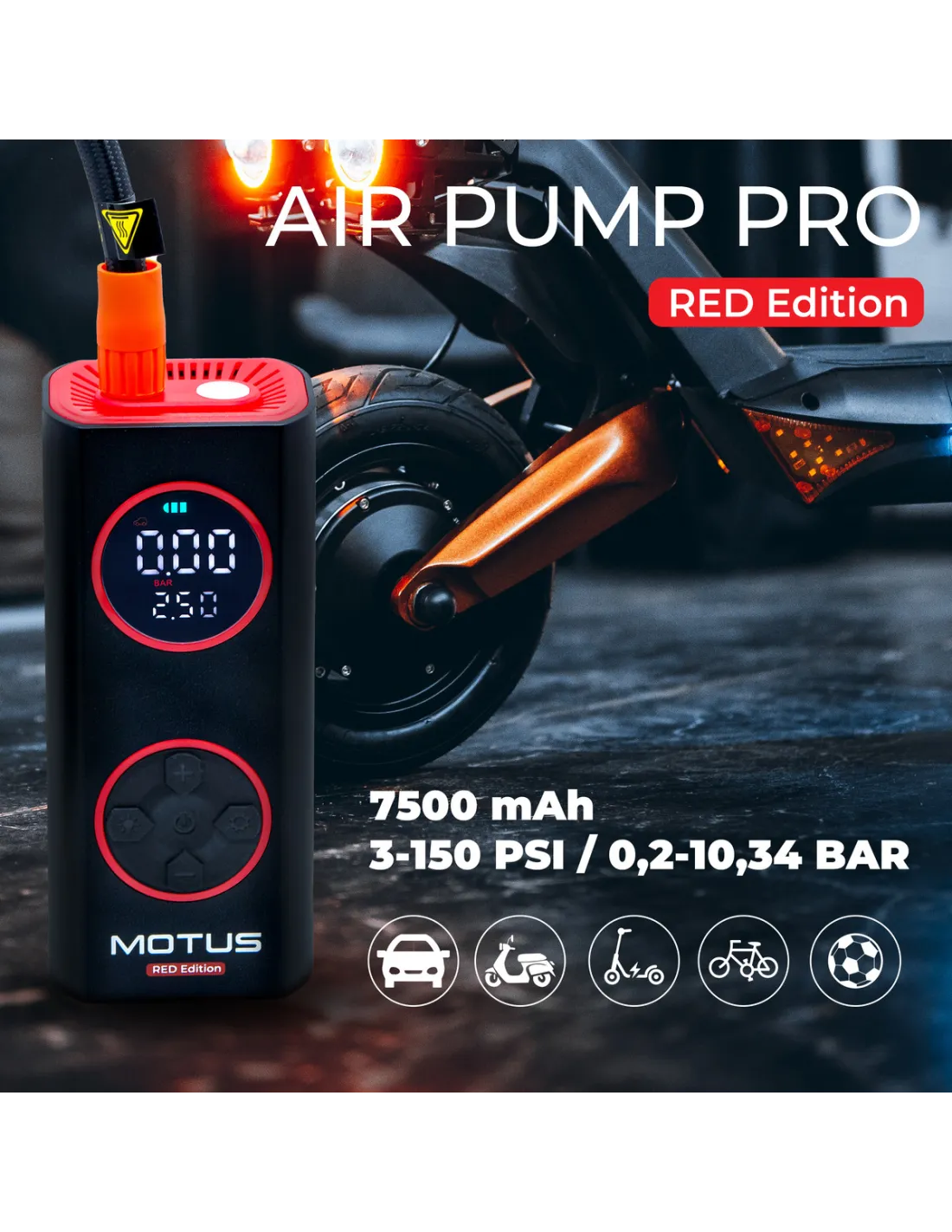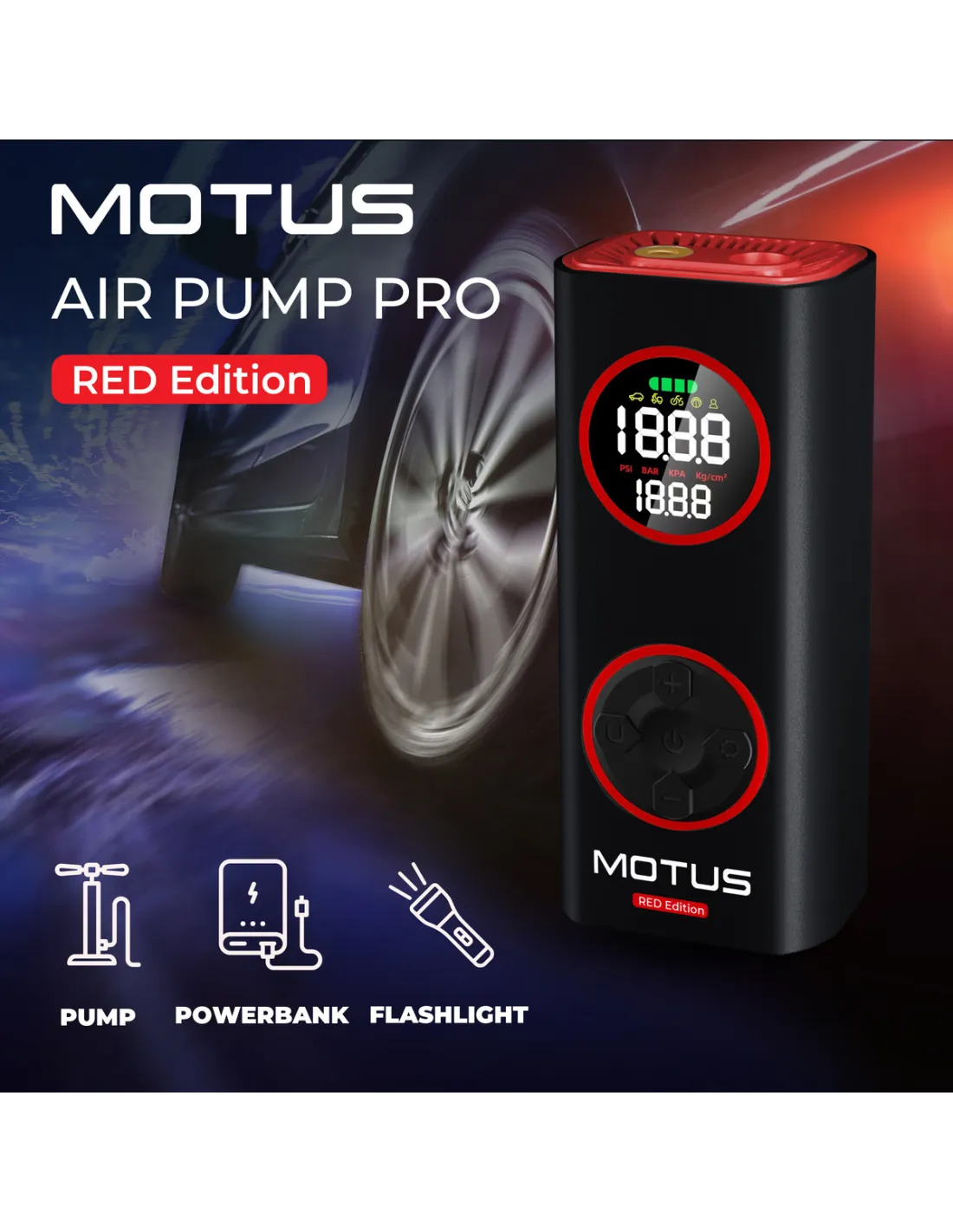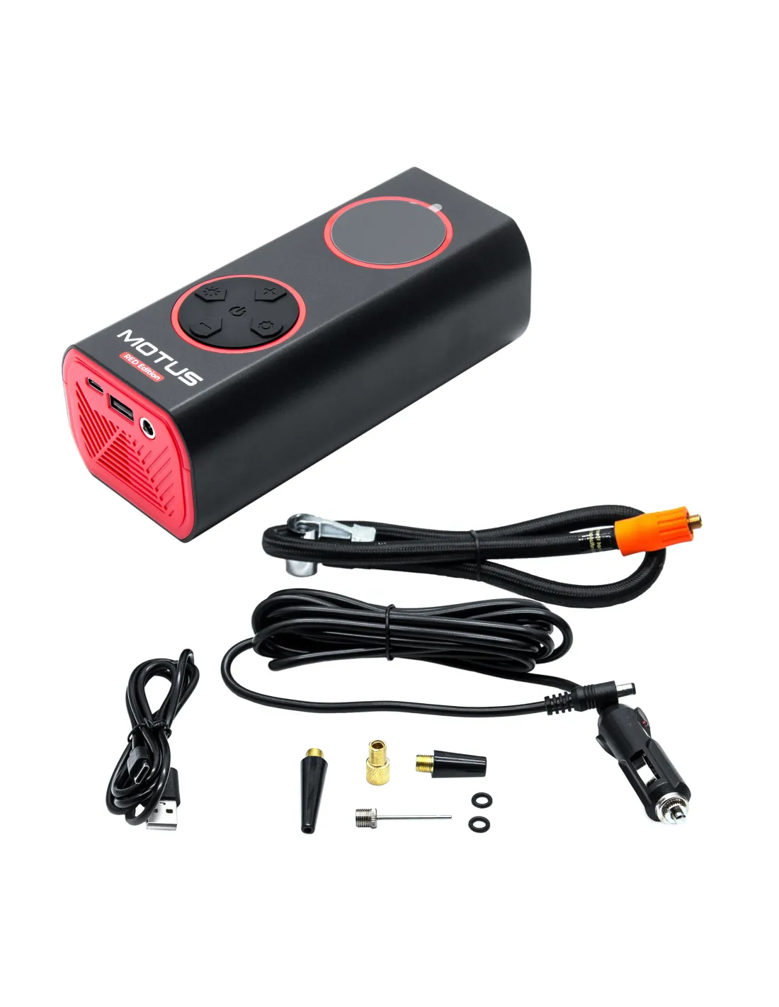 Elektryczna pompka Motus AirPump Pro Red Edition to wszechstronne urządzenie idealne do pompowania opon, piłek czy zabawek. Inteligentny system doboru ciśnienia, cyfrowy wyświetlacz i funkcja powerbanku zapewniają wygodę i funkcjonalność w każdej sytuacji. Kompaktowa, wydajna i łatwa w użyciu – oszczędzaj czas z Motus AirPump Pro!