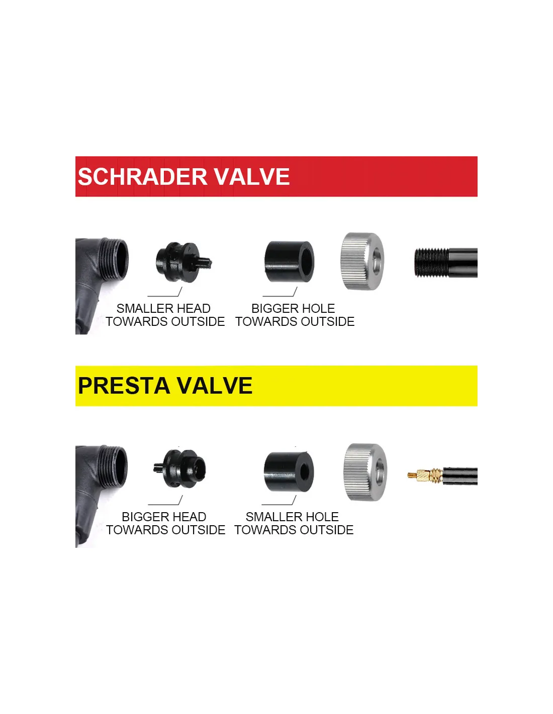 - szybka zmiana wejścia na wentyl z Schrader na Presta i na odwrót