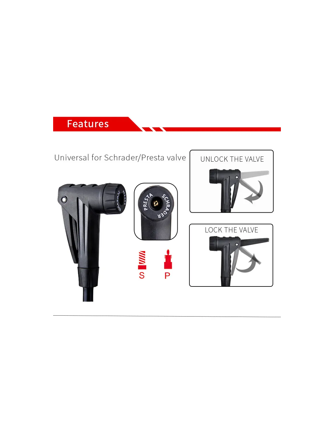 EasyDo Rocket-5 to pompka przeznaczona do użytku na co dzień. Wejście na dwa wentyle, czyli Presta oraz Schrader pozwala napompować opony w rowerach szosowych, rowerach górskich, ale i motocyklach oraz samochodach. Najwyższa jakość wykonania oraz ergonomiczny uchwyt w kształcie litery T pokryty gumowym materiałem zapewniającym dobrą przyczepność podczas pompowania sprzętu. Wbudowany manometr pozwala na bardzo precyzyjne uzupełnienie powietrza, by móc zapewnić maksimum bezpieczeństwa użytkownikowi danego pojazdu. Maksymalne możliwe ciśnienie do wtłoczenia wynosi 160 Psi, czyli około 11 Bar. Rewelacyjny wynik pozwalający na napompowanie nawet wyczynowych rowerów szosowych! Wykonana z aluminium pompka to też gwarancja długowieczności i zachowania świeżości wyglądu, nawet po wielu latach.