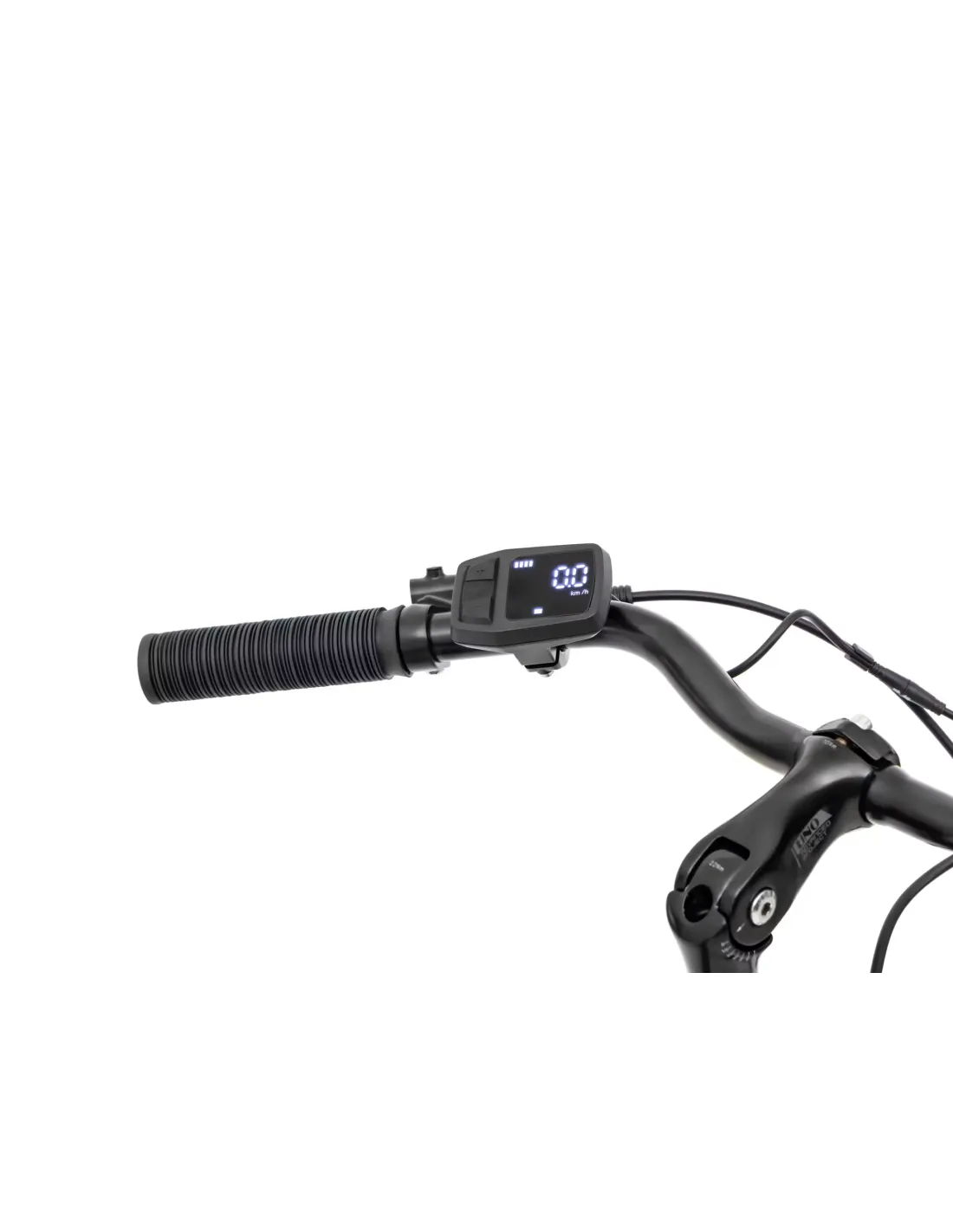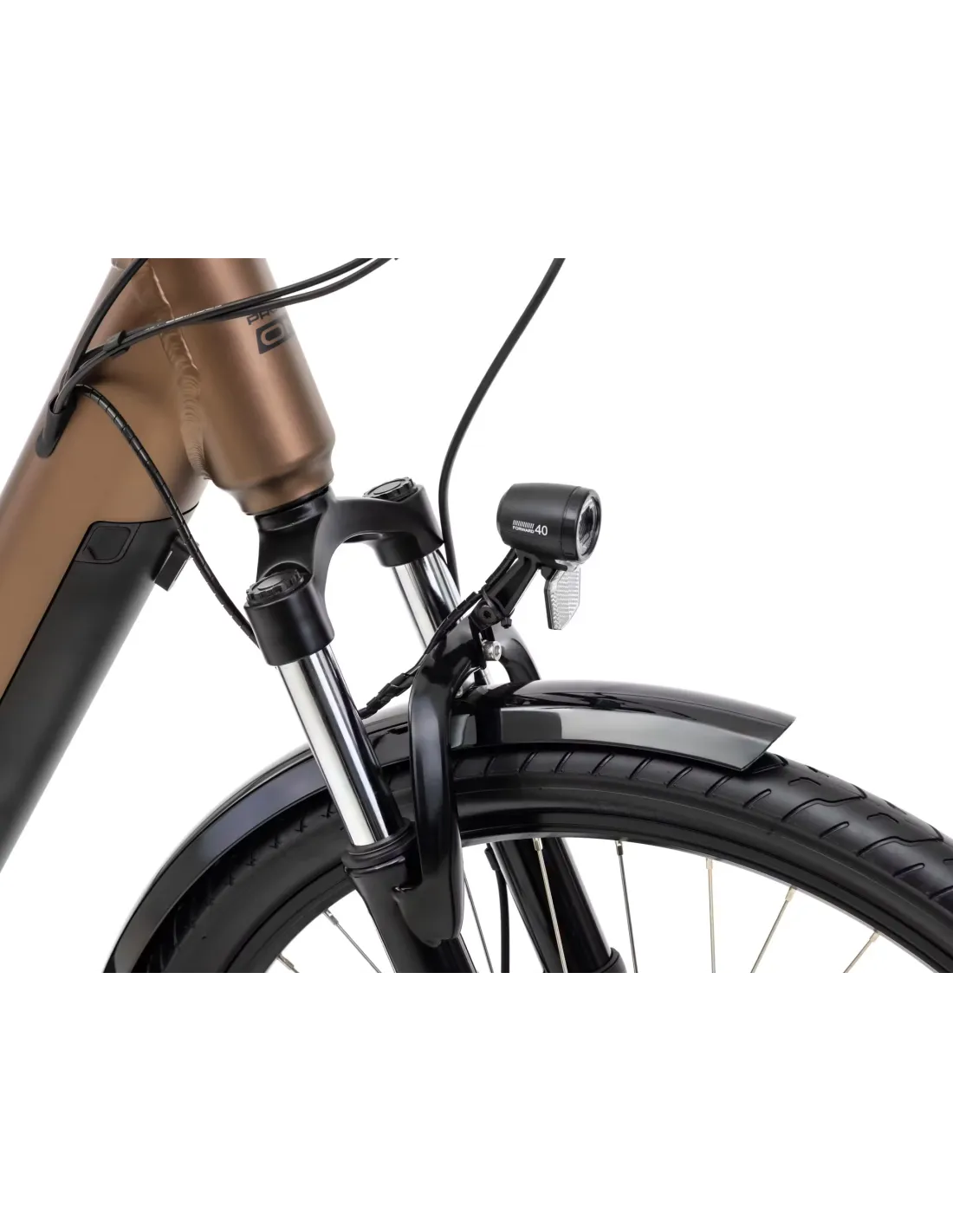 Model został kompleksowo przygotowany do jazdy od pierwszego dnia użytkowania. Zintegrowane oświetlenie LED z przodu i z tyłu zwiększa widoczność po zmroku i poprawia bezpieczeństwo w ruchu miejskim. Solidny bagażnik AtranVelo City umożliwia wygodne przewożenie torby, zakupów czy sakw, czyniąc rower praktycznym środkiem transportu. Podpórka Atran Velo Parko ułatwia parkowanie w dowolnym miejscu, a błotniki skutecznie chronią odzież przed zabrudzeniami podczas jazdy w gorszych warunkach pogodowych. Komfort dopełnia wygodne siodło Vader 862 oraz odpowiednio dobrana szerokość kierownicy, zapewniająca stabilne i pewne prowadzenie. Całość tworzy w pełni funkcjonalny, miejski e-bike o wadze 24 kg, który łączy styl, wygodę i praktyczność.