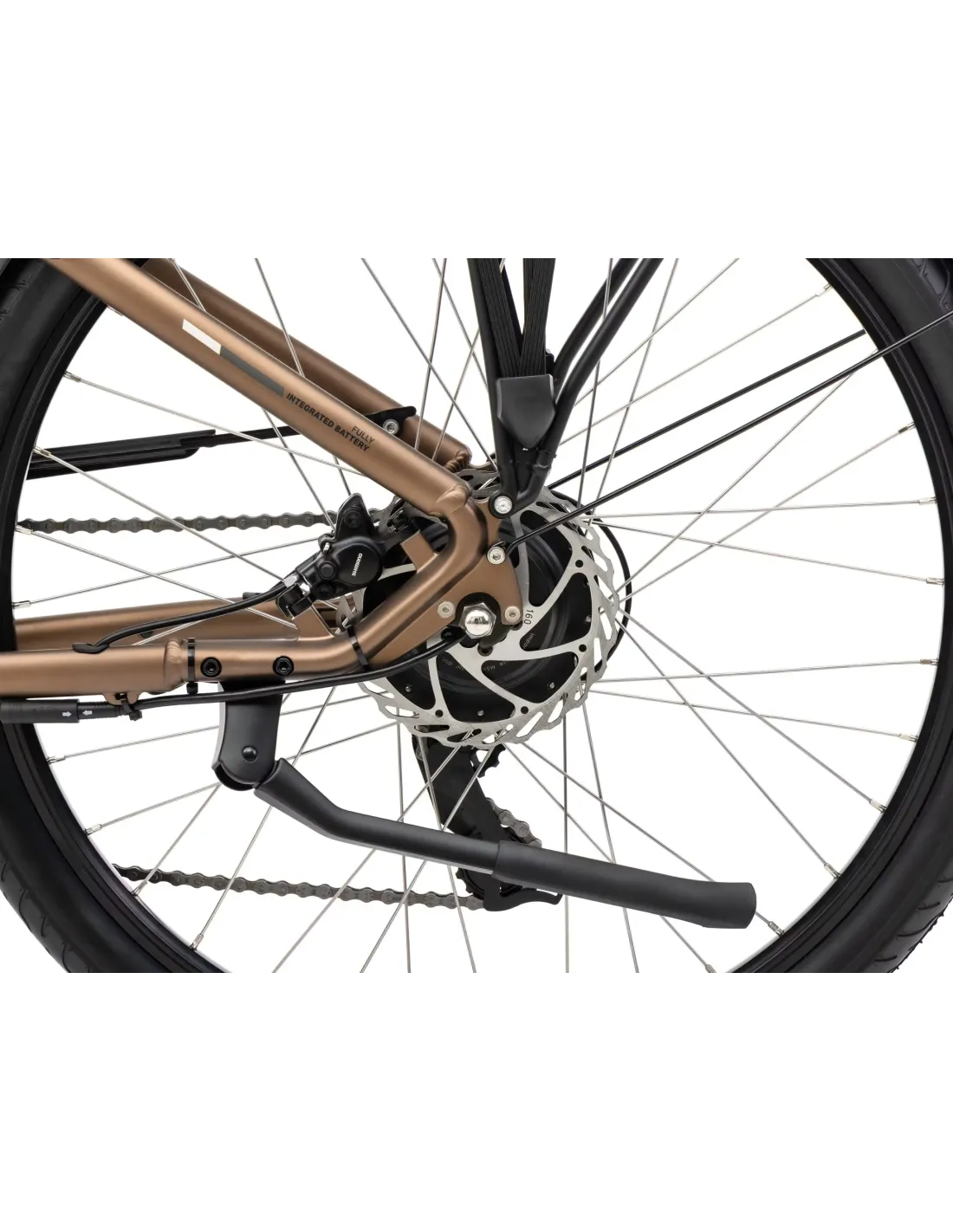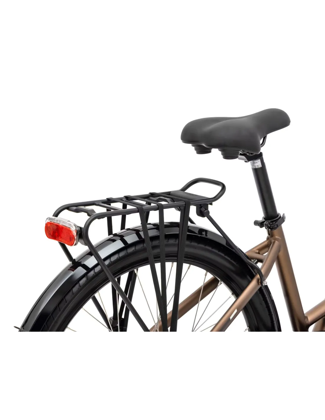 Aluminiowa rama w rozmiarze 16” (S) została zaprojektowana z myślą o maksymalnej wygodzie użytkowników. Charakterystyczna konstrukcja typu Wave z niskim przekrokiem znacząco ułatwia wsiadanie i zsiadanie z roweru, co ma szczególne znaczenie w codziennym użytkowaniu w mieście. Lekki, a zarazem wytrzymały materiał zapewnia trwałość konstrukcji przy zachowaniu odpowiedniej sztywności podczas jazdy. Ergonomiczna geometria pozwala przyjąć wyprostowaną, komfortową pozycję, która odciąża plecy i nadgarstki.