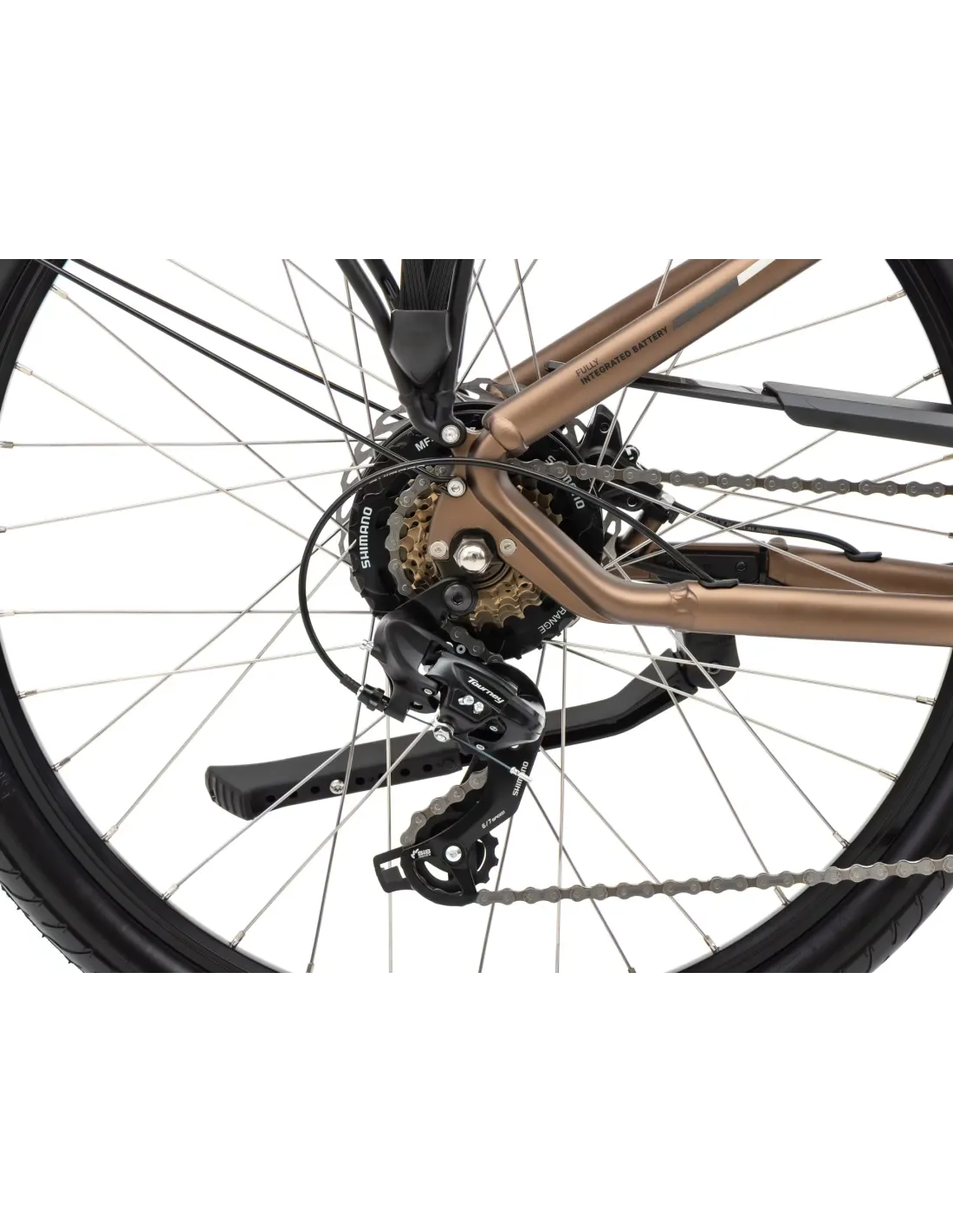 Rower posiada napęd 1x7, oparty na tylnej przerzutce Shimano Tourney TY300 oraz wolnobiegu 14-34T. To sprawdzona, łatwa w obsłudze konfiguracja, idealna do miejskiej jazdy. Szeroki zakres przełożeń umożliwia komfortowe pokonywanie zarówno płaskich odcinków, jak i delikatnych podjazdów. Manetki Shimano ST-EF515 zapewniają wygodną i intuicyjną zmianę biegów.