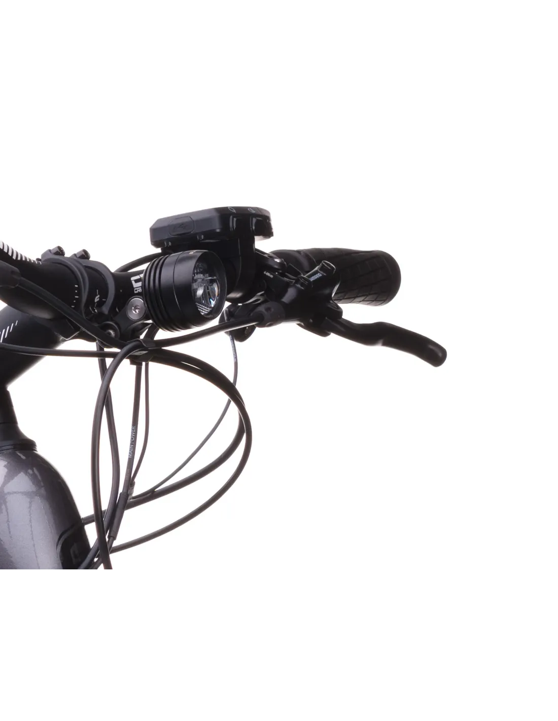 Pełną kontrolę nad parametrami jazdy zapewnia nowoczesny, kolorowy wyświetlacz LCD Panasonic umieszczony po lewej stronie uchwytu kierownicy. Przekątna ekranu wynosi ok. 4,5 cm. To inteligentny komputer pokładowy o wysokim kontraście, który pozostaje czytelny nawet w pełnym słońcu. Ekran w czasie rzeczywistym informuje o prędkości, dystansie, poziomie naładowania baterii oraz o aktualnym trybie wspomagania. Istnieje możliwość wyboru 10 języków. Intuicyjny interfejs pozwala na błyskawiczną zmianę ustawień. Solidna obudowa i wysoka klasa odporności na warunki atmosferyczne gwarantują, że urządzenie sprawdzi się w każdą pogodę. Jednostka sterująca ma stopień ochrony IPX5 przed wodą i pyłem. Ponadto wyświetlacz jest podłączony do Bluetooth, dzięki czemu możliwe jest korzystanie z aplikacji na smartfony takich jak „Koomot” i „Strava”.